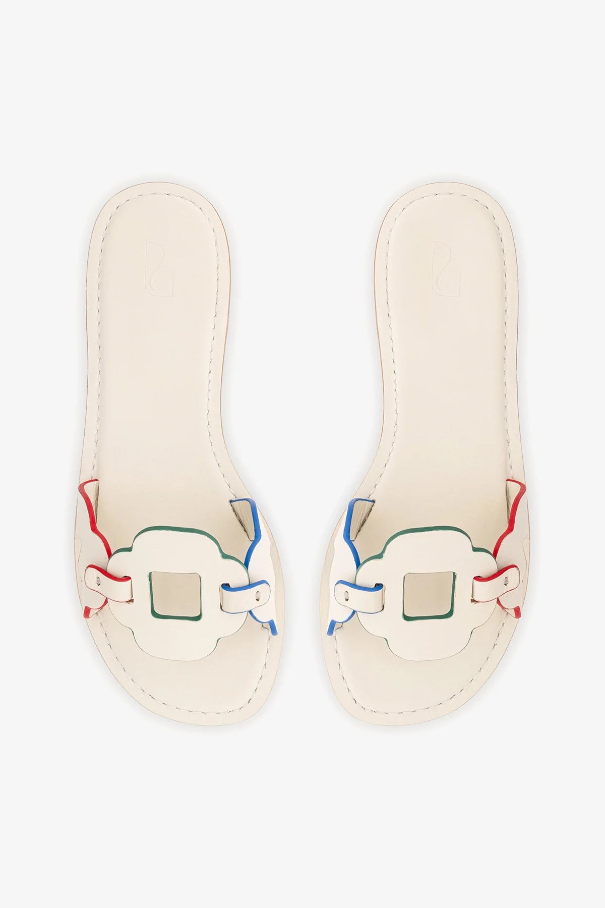 A flat slide Margherita traz um toque lúdico para o dia a dia. Com seu detalhe floral multicolorido e acabamento em couro macio, ela adiciona personalidade instantânea a qualquer look – do jeans reto ao short de alfaiataria.