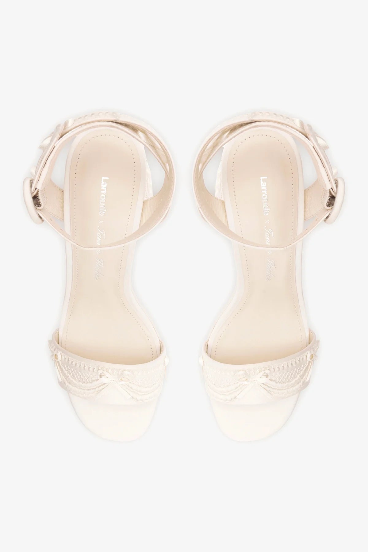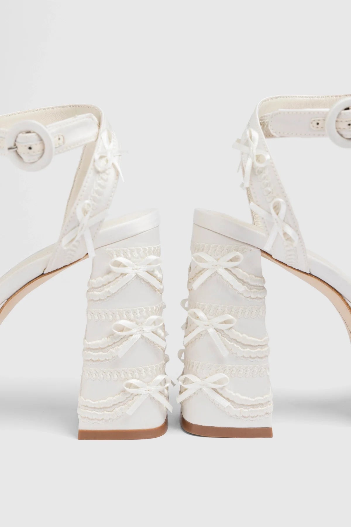 Sandália plataforma em cetim branco com aplicações em relevo e laços distribuídas pelo sapato, remetendo à decoração de um bolo de casamento. O salto bloco alto traz conforto e estabilidade para festas que duram a noite toda.